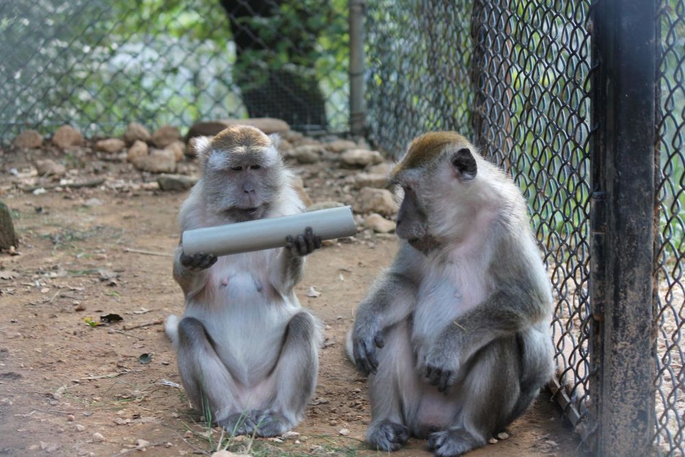 Come ormai è abitudine durante le giornate di festa, anche in occasione della precedente Pasqua, abbiamo portato loro dei regali: scatole addobbate con all’interno semi, noci e cereali di cui i macachi sono ghiotti. Giusto il tempo di introdurle nell’area che le hanno scartate e gustato il contenuto. Inutile dire che hanno molto apprezzato il regalo! Per il resto, le giornate dei nostri due macachi trascorrono serene e tranquille, tra un vecchio arricchimento e uno nuovo che vengono introdotti nella loro area.