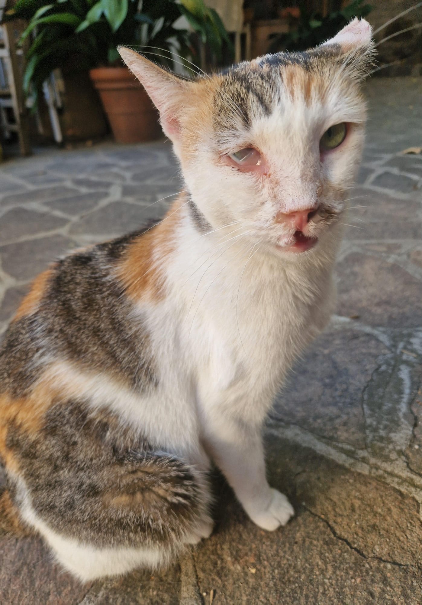 Possiamo dire che l’accoglienza verso gli altri gatti non è proprio il suo punto forte, ma in fondo questo non fa che sottolineare il suo desiderio di avere tutte le attenzioni per sé. Rispetto alla sua rinotracheite cronica, nell’ultimo periodo ha trovato abbastanza giovamento nell’assunzione di un integratore alimentare a base di foglie d’olivo e calendula, permettendoci di sospendere temporaneamente la somministrazione di antibiotici.