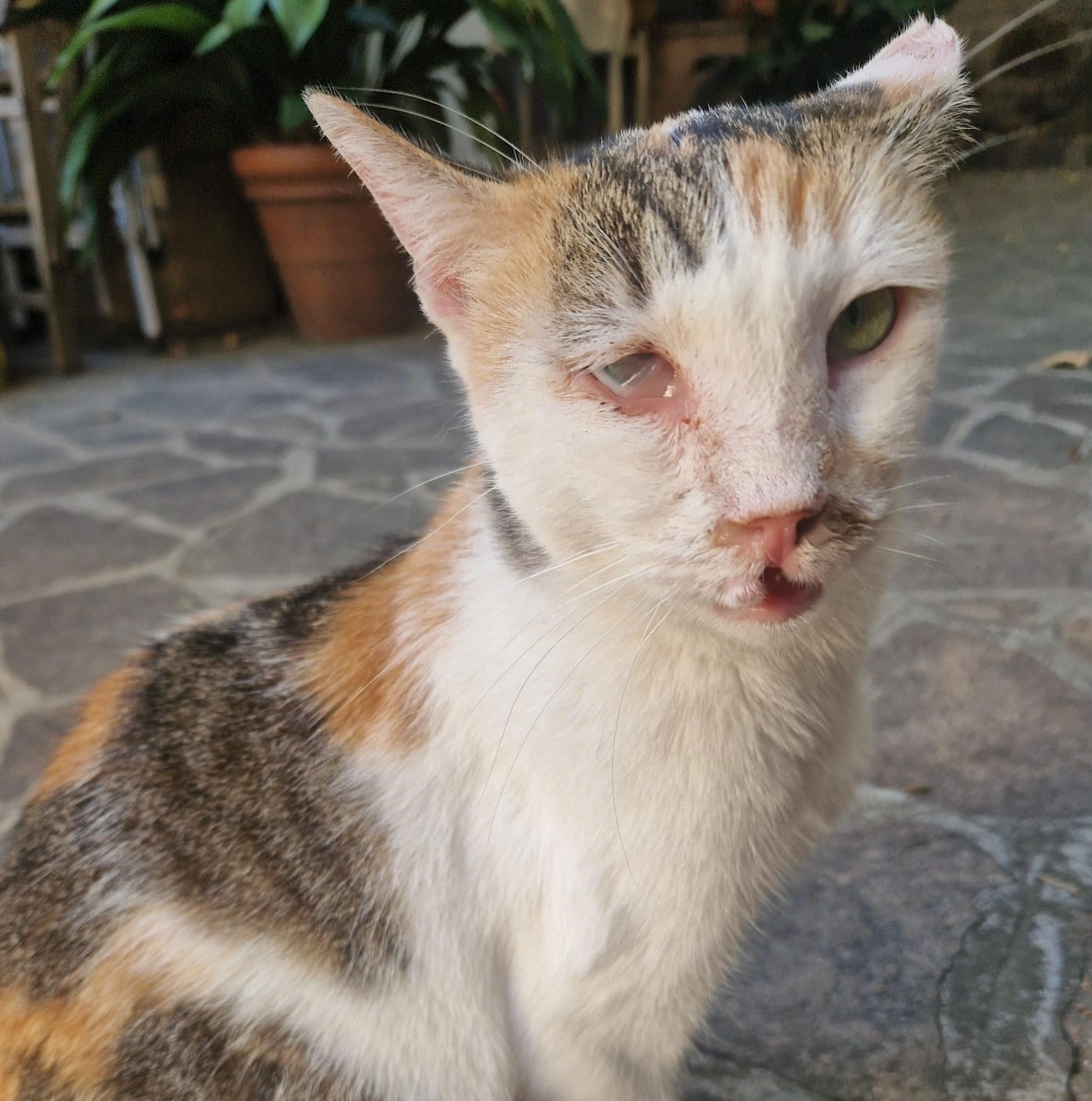 Pina soffre di rinotracheite cronica, una malattia delle vie respiratorie superiori con cui dovrà convivere per il resto della sua vita. Con l’arrivo del freddo, i sintomi si acutizzano, soprattutto la produzione di muco. Naso e occhi devono rimanere il più possibile puliti per evitare complicazioni, per questo motivo cerco frequentemente di asciugare il moccolo perenne che scende dal suo naso, ma non sempre lei me lo permette, così approfitto dei momenti di tenerezza, quando si avvicina a me e si lascia coccolare e baciare: allora la pulisco senza stressarla troppo, anzi apprezza!