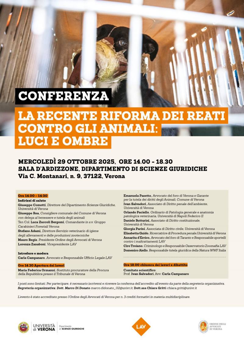 Il 29 ottobre a Verona, nella Sala d’Ardizzone del Dipartimento di Scienze Giuridiche dell’Università di Verona, si svolgerà la conferenza “La recente riforma dei reati contro gli animali: luci e ombre” , organizzata dall’Università in collaborazione con LAV.