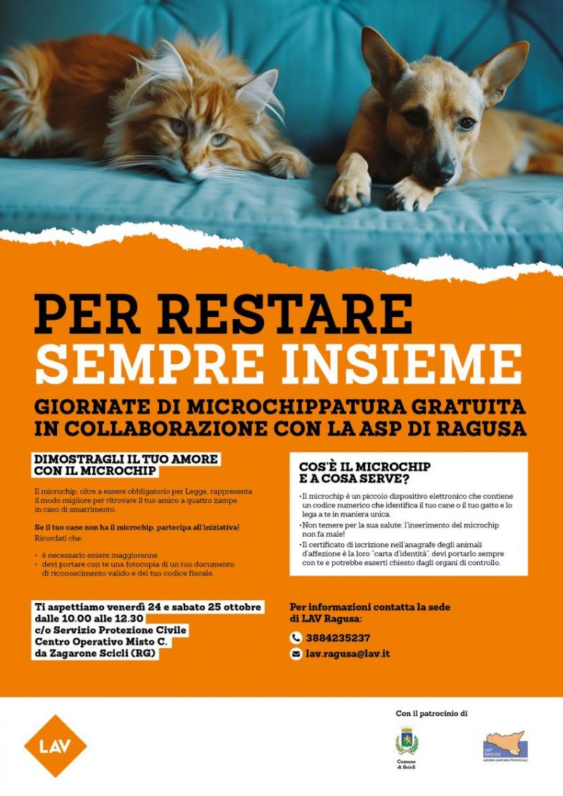 Dal 24 al 26 ottobre noi di LAV saremo a Scicli (RG). Venerdì 24 e sabato 25 ottobre mattina ci dedicheremo alla microchippatura dei tuoi amici a 4 zampe.