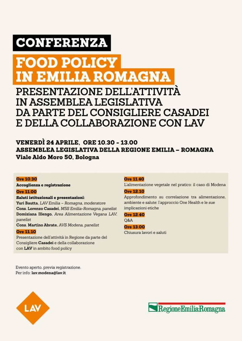 Domani, venerdì 24 aprile, presso la sede dell'Assemblea Legislativa della Regione Emilia-Romagna si terrà la conferenza organizzata dal Consigliere Lorenzo Casadei in collaborazione con LAV per presentare il lavoro sviluppato sulla Food Policy, con un focus sulle strategie per rendere i sistemi alimentari più sostenibili, inclusivi e orientati al benessere collettivo.