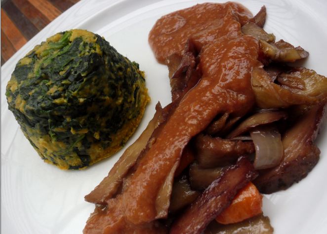 Cuocere gli spinaci con aglio e carote. Preparare una pastella con farine, acqua e condimenti, unire agli spinaci e cuocere in forno a 200° per 20 minuti negli stampini. Rosolare le verdure per il seitan, aggiungere il seitan e sfumare con vino e brodo. Frullare le verdure con il fondo di cottura, aggiungere vino e amido fino ad addensare. Servire il tortino con gli straccetti e la salsa.