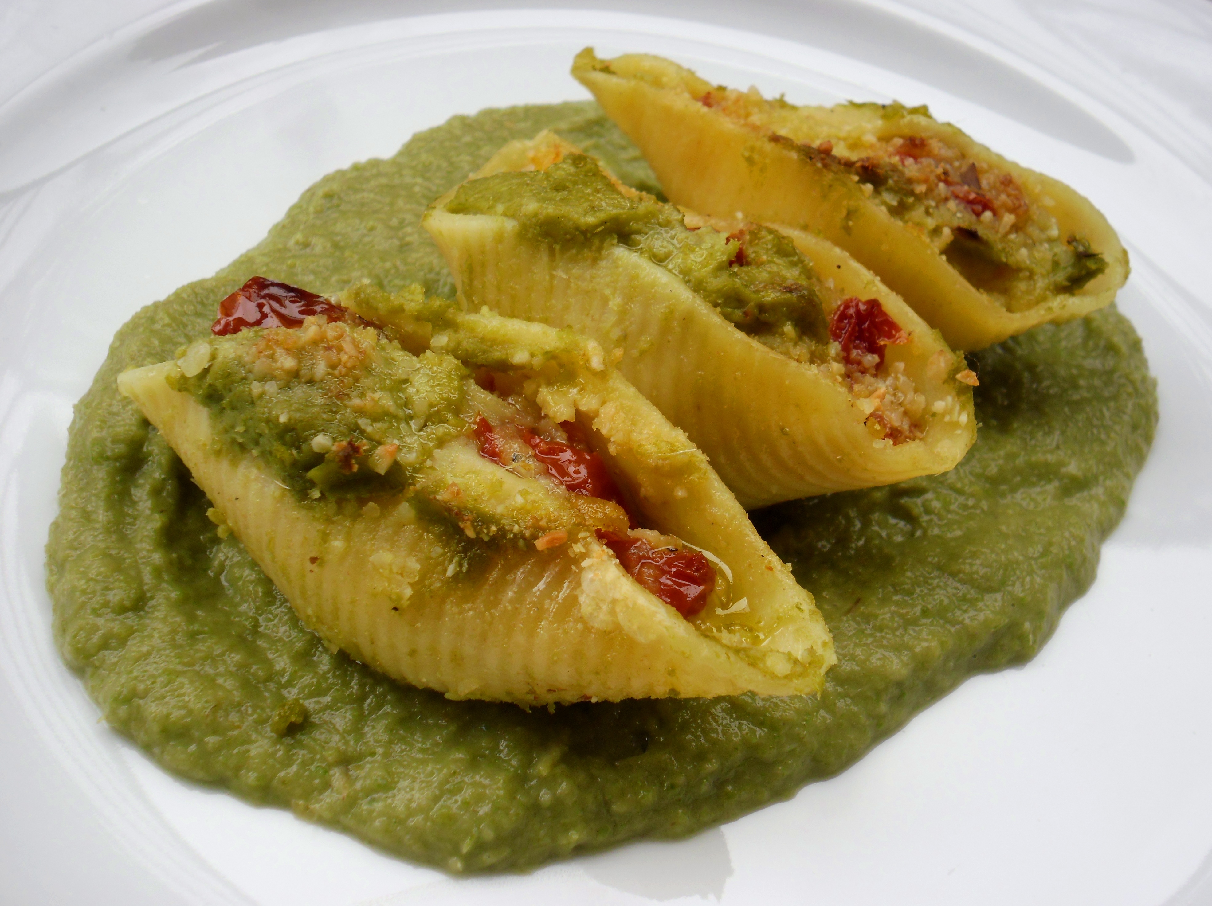 Lessare le patate, schiacciarle e condirle con brodo, olio, sale, pepe e pomodori secchi. Pulire e cuocere i carciofi in padella con olio, aglio e prezzemolo, poi frullarli con il brodo. Cuocere i conchiglioni, farcirli con la crema di patate e disporli in una teglia con crema di carciofi sul fondo. Aggiungere mandorle e lievito tritati, un filo d’olio e coprire con carta forno. Cuocere a 180° per 30 minuti, scoprendo gli ultimi 5 per gratinare.