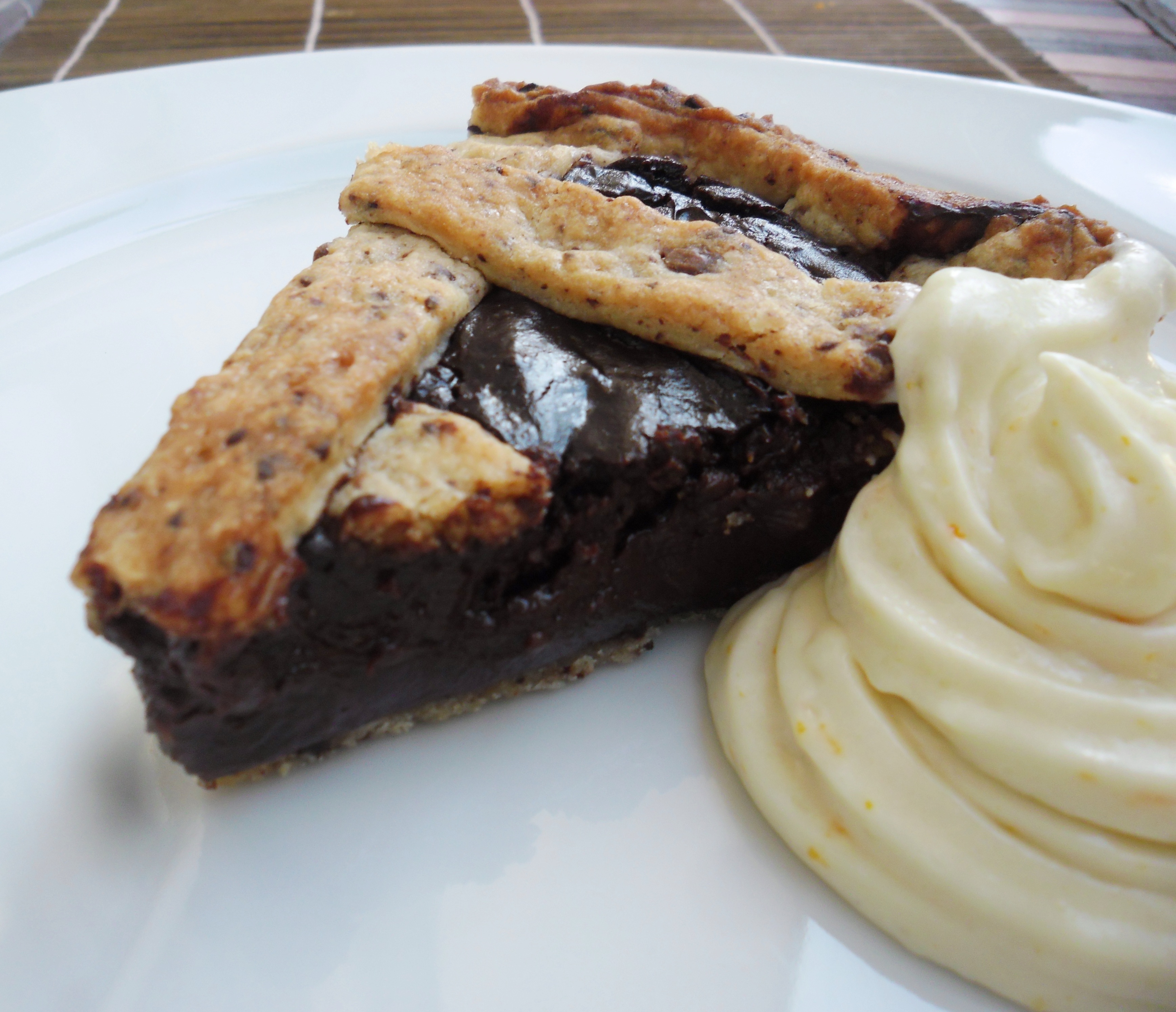 Preparare la frolla unendo ingredienti secchi e margarina, poi il latte. Far riposare in frigo. Preparare la crema con latte, zucchero e amido e unire la ganache al cioccolato. Stendere la frolla, versare la crema e cuocere a 180° per 35–40 minuti. Per la mousse, aromatizzare il latte con arancia, addensare e far raffreddare prima di servire.