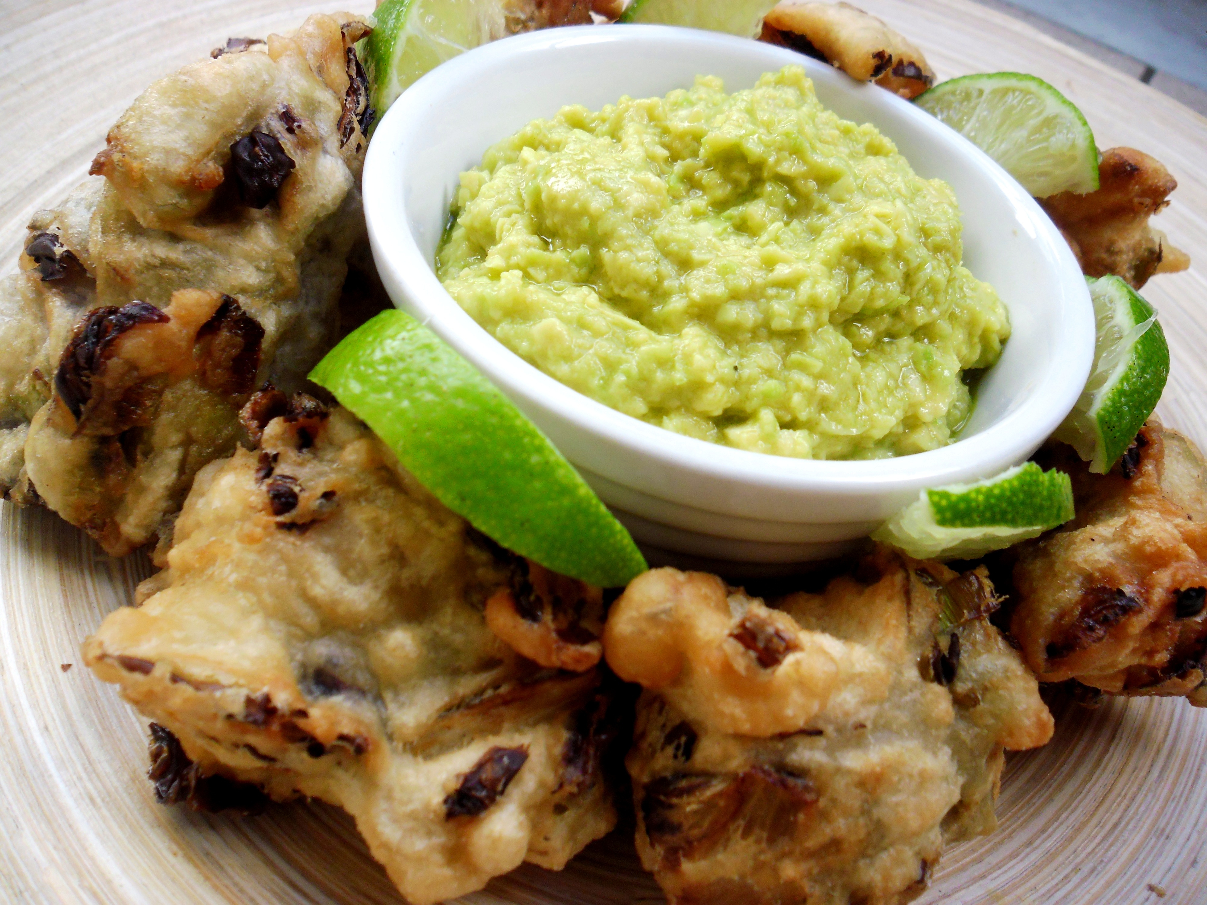 In una ciotola versare farina e sale, al centro mettere il lievito e aggiungere poco per volta l’acqua fino a ottenere una pastella liscia. Coprire e lasciar riposare 15 minuti. Cuocere porro e radicchio in padella con olio e sale per circa 10 minuti. Una volta tiepidi unirli alla pastella e far riposare altri 20 minuti. Friggere il composto a cucchiaiate in olio caldo fino a doratura. Per la salsa, frullare grossolanamente avocado, succo di lime, sale, pepe e olio. Conservare in frigo fino al servizio.