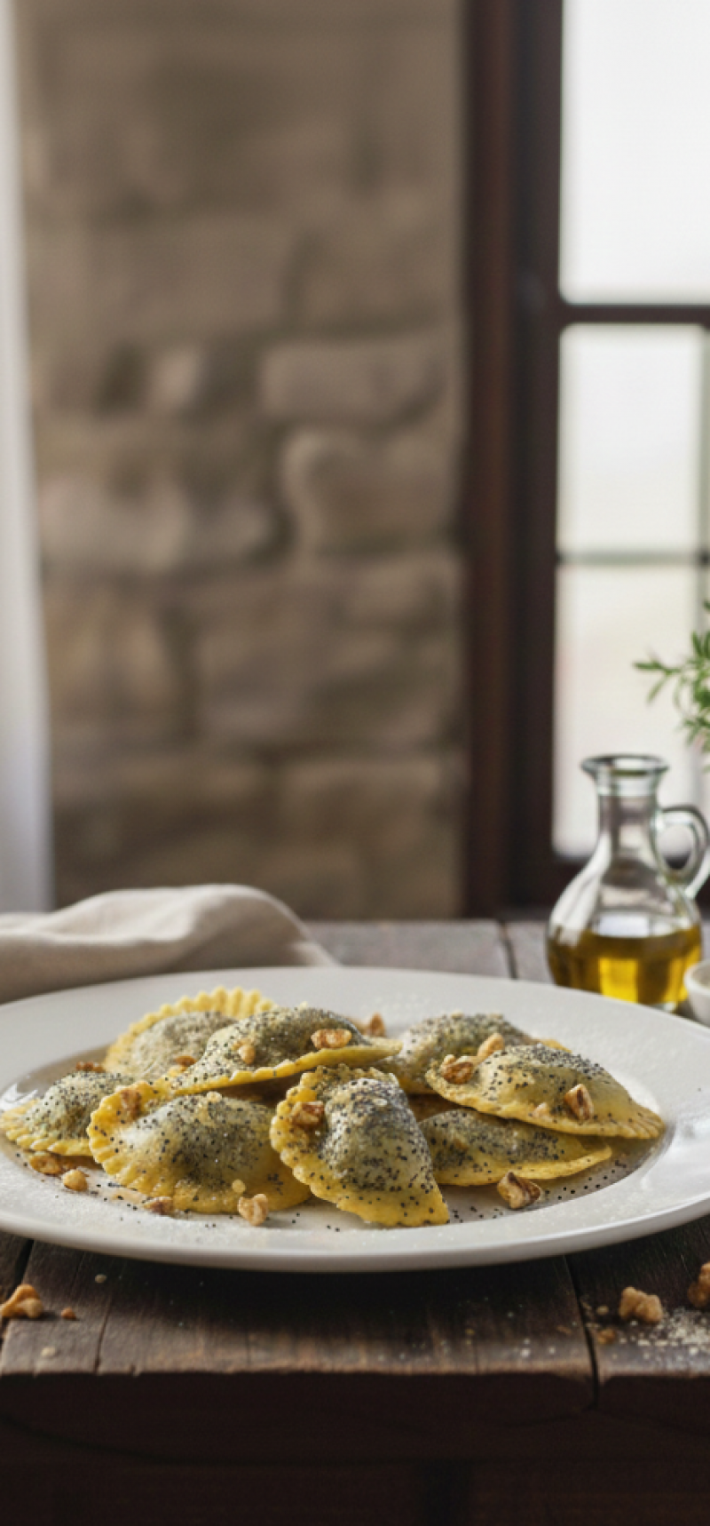 Per la pasta metti la farina su una spianatoia, fai la “fontana” al centro, aggiungi l’acqua, l’olio, il sale e la curcuma. Impasta fino a ottenere un composto elastico, inserisci i semi di papavero e continua ad amalgamare. Fai una palla e mettila da parte a riposare per trenta minuti, coperta con la pellicola alimentare.